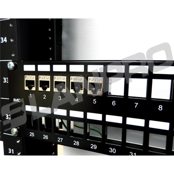 Patch panel iMC® de la Serie 8000 no cargados, blindados, de compatibilidad modular, con 24 puertos para módulos desde CAT 3 a CAT 6A, audio, video y/o módulos adaptadores de fibra óptica.