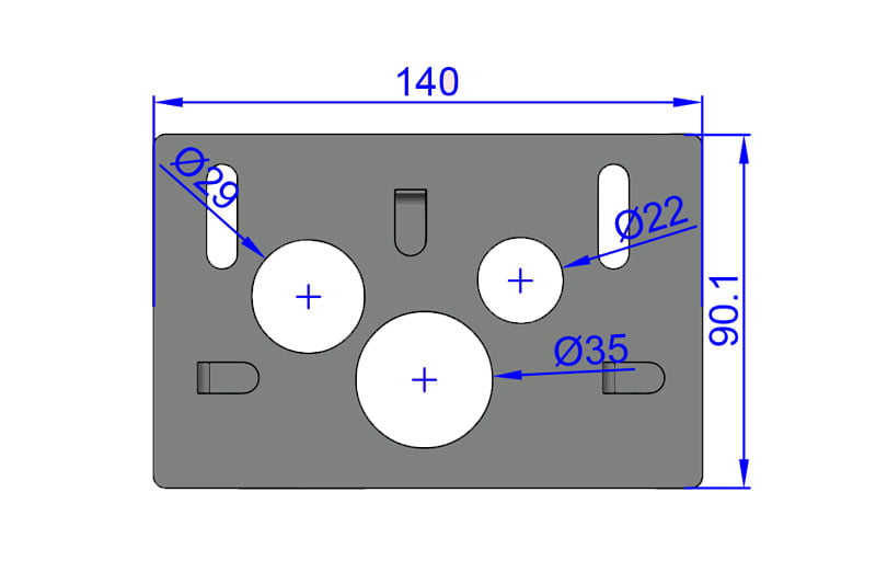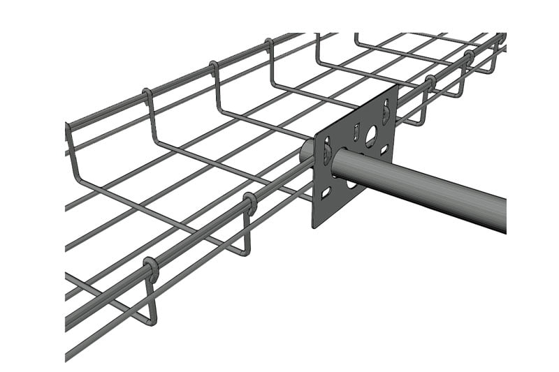 Placa salida a tubo universal fabricada en lámina galvanizada, diseñada para la conexión de tubería a bandejas tipo malla con peraltes de 54, 66, 105 y 116 mm. Cuenta con orificios para tubería de ¾”, 1” y 1 ¼”. No requiere tornillería y cumple con la NOM-001-SEDE-2012, así como normas nacionales e internacionales aplicables. Marca Charofil.